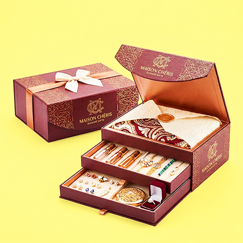 Our products are stylized with beautiful holders and die-cut designs. It makes it a perfect choice for business and personal use. You can get these luxurious gift boxes for women at reasonable prices and great discount offers. To make your loved ones feel more special, you can give them luxury gifts with customized gift boxes.